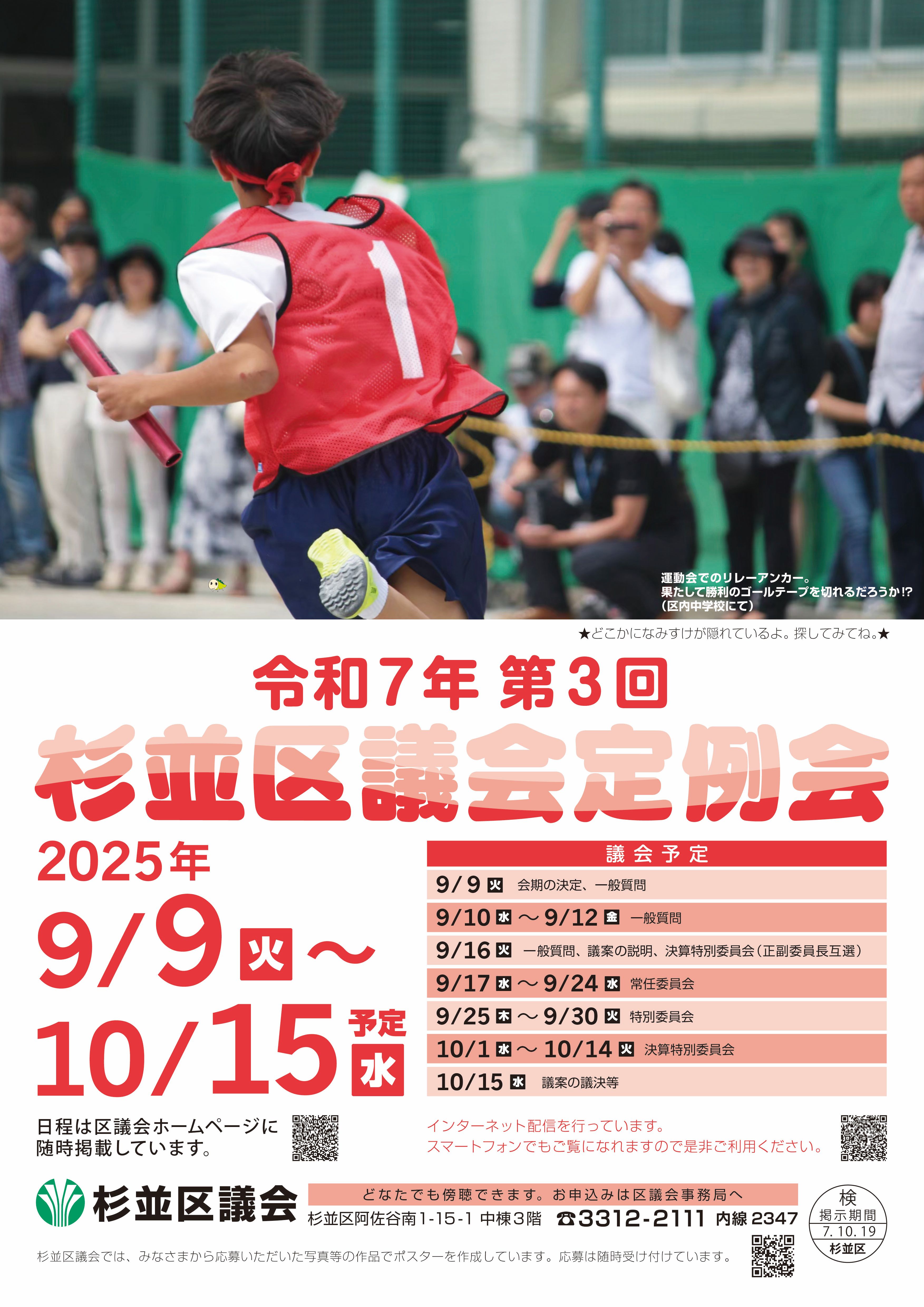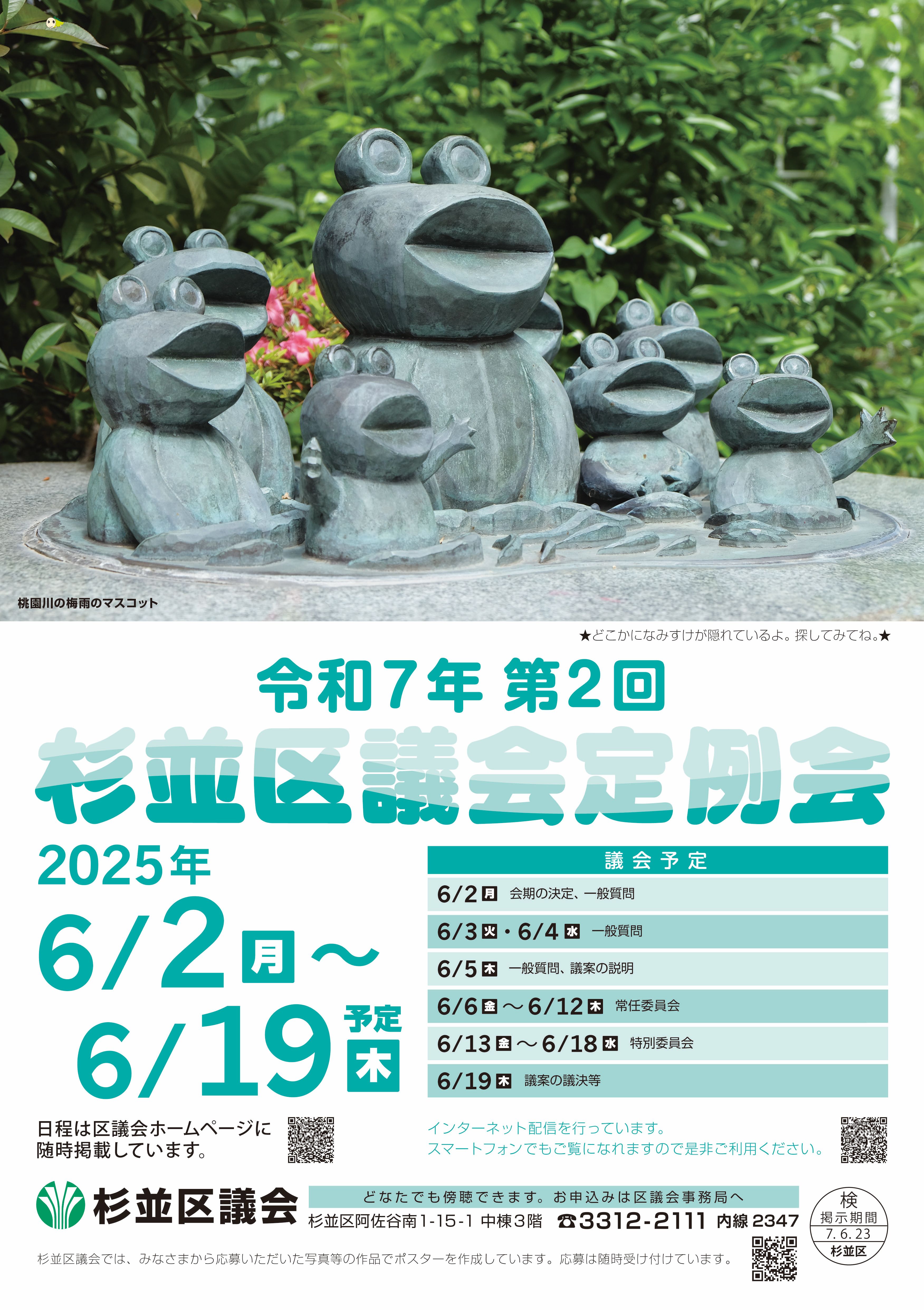 〒166-8570 杉並区阿佐谷南1丁目15番1号 杉並区役所中棟3階 区議会事務局広報担当まで