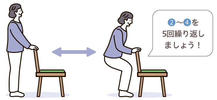 - 椅子に腰かけるイメージで、ゆっくり5数えながらしゃがみます。