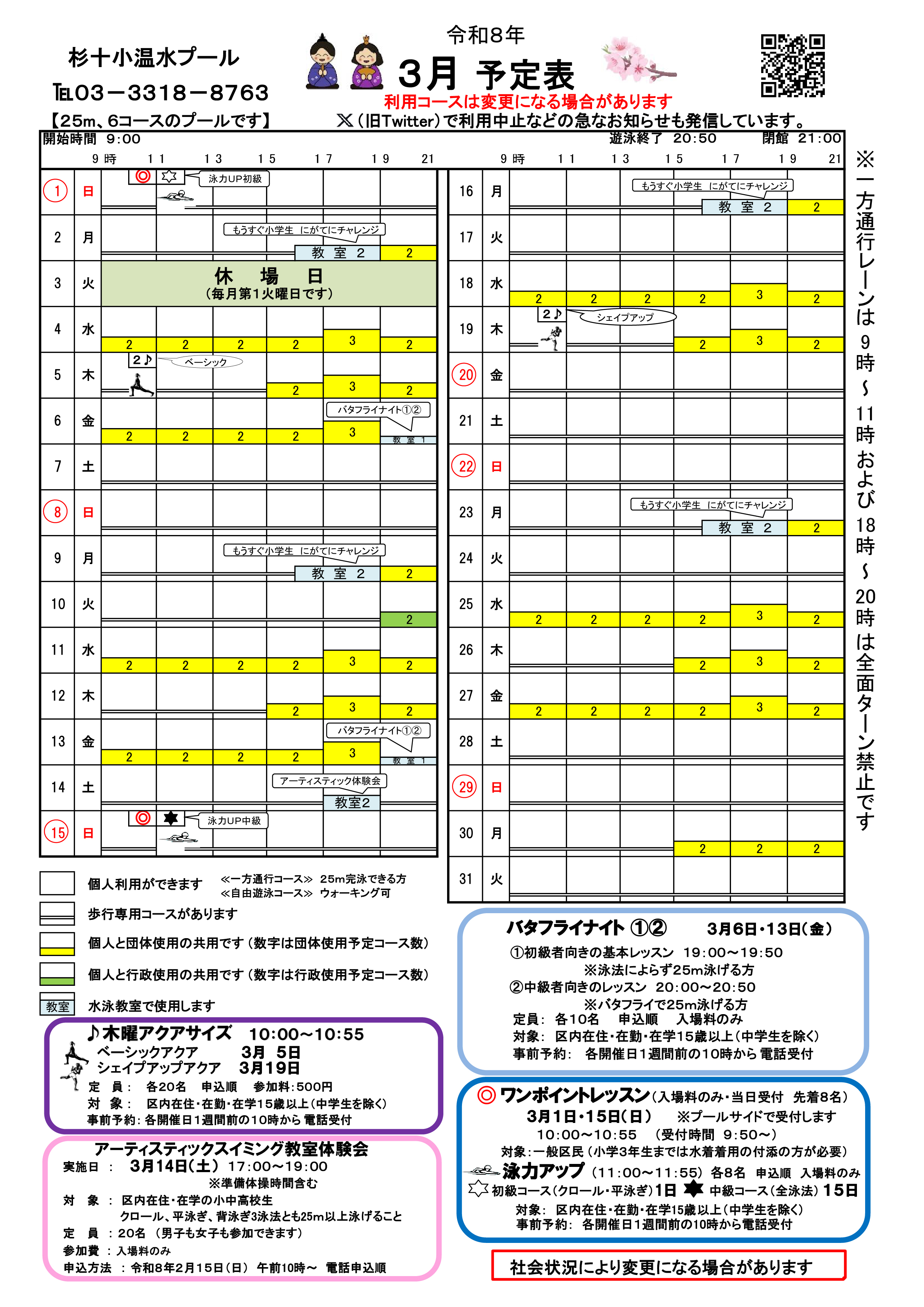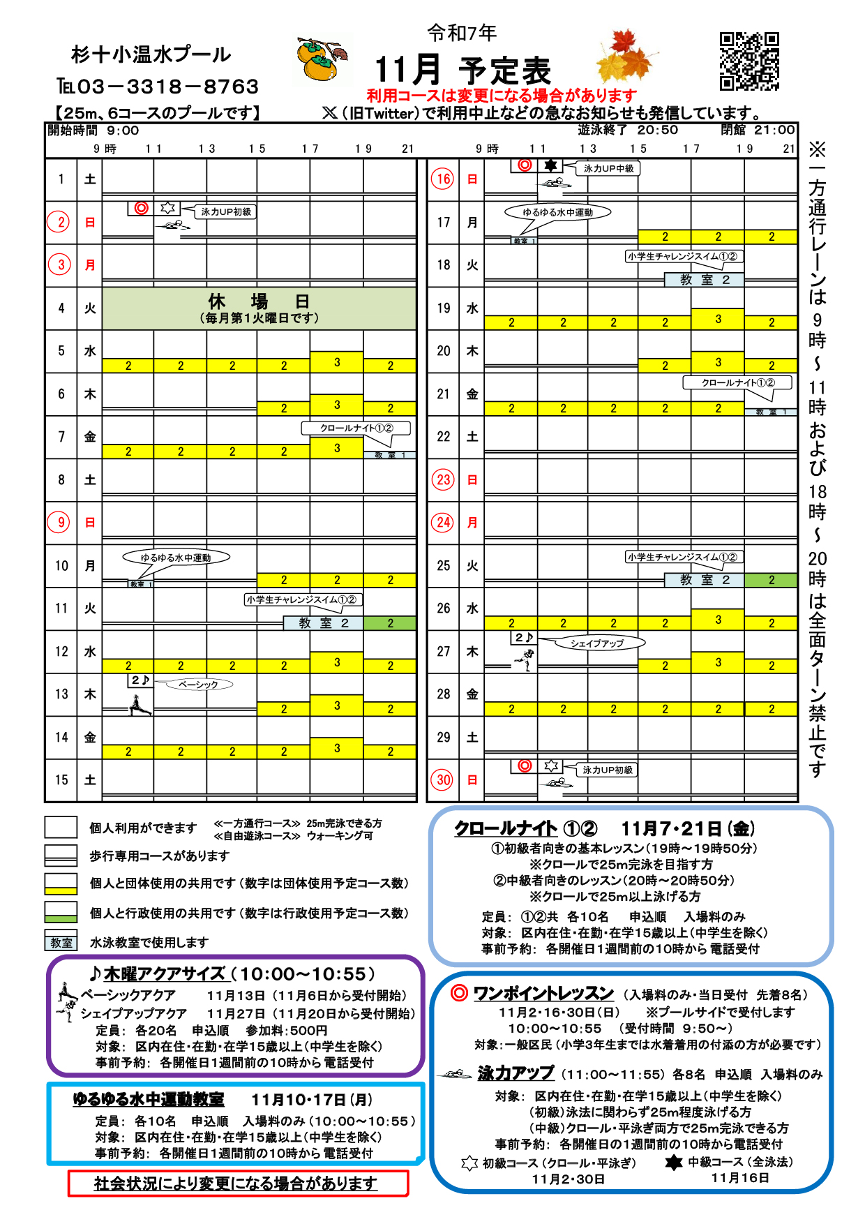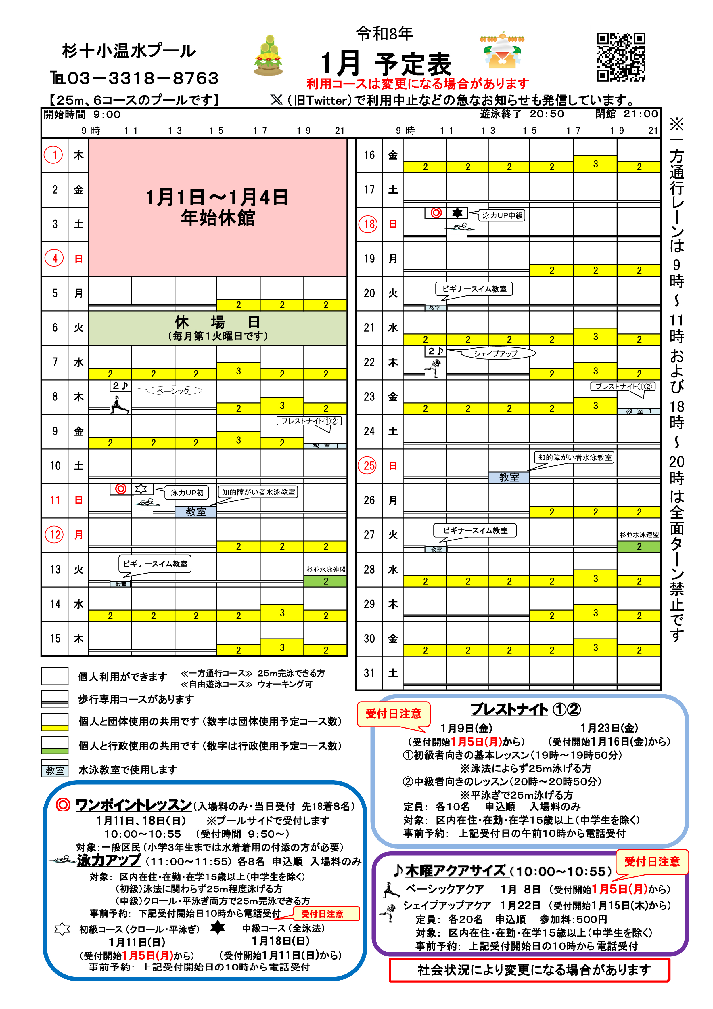 杉並第十小学校温水プールの予定は以下の予定表またはX(旧Twitter)アカウントでご確認ください。