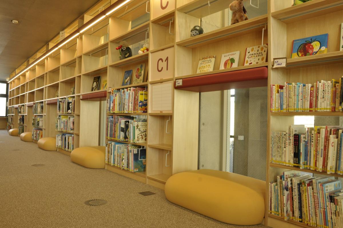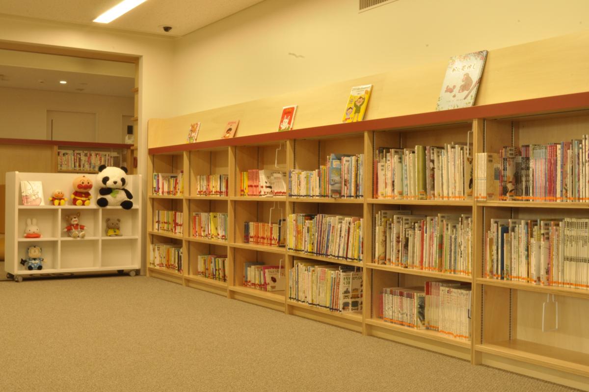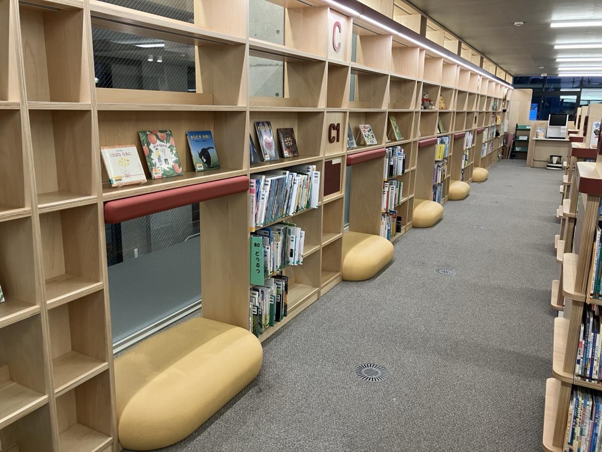 靴を脱いで入るスペースに、絵本や紙芝居が並んでいます。積み木のようなクッションがあり、遊びながら読み聞かせを楽しめます。定期的に「おはなし会」も開催され、親子でゆったり過ごせる人気の場所です。