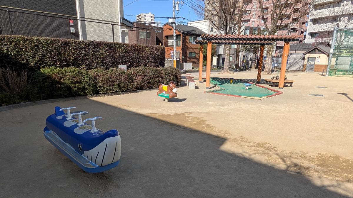 3人乗りのスイング遊具と、スプリング遊具です。近くの公園にはあまりない遊具のため、この遊具のために訪れるのもいいかもしれません。