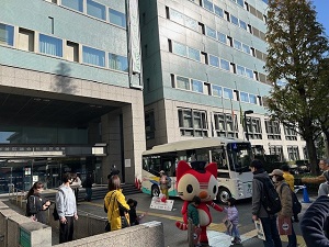 快晴の秋晴れのなか、運行事業者の協力のもと、けやき路線(阿佐ケ谷駅~浜田山駅)で運行している環境にやさしい電気(EV)バスの展示や、かんにゃん。(関東バスのキャラクター)も登場するなど会場は盛り上がり、300名を超える方々にご来場いただきました。開催会場では「すぎ丸」のクリアファイルに、バスなどの公共交通に関するチラシや、「区内の南北移動を便利に」というコンセプトで作成した公共交通アクセスマップ等の配布をし、「すぎ丸」をはじめ公共交通のPRにつなげました。