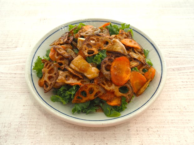 - れんこんは皮つきのままよく洗い、厚さ3ミリメートルの半月切りにし、水にさらして水気をきる。にんじんは皮つきのままよく洗い、厚さ3ミリメートルの薄切りにする。ごぼうはよく洗って、斜め薄切りにし、水にさらして水気をきる。