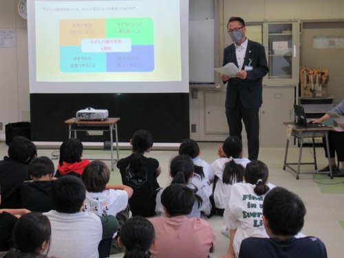 子ども政策担当課長から、「子どもにやさしいまち」「全ての子どもが自分らしく生きていくことができるまち」を実現するための決まり(約束)となる条例をつくろうとしていること、そのために主役である子どもたちから思いを聴き、たくさんの意見を取り入れたいというお話がありました。
